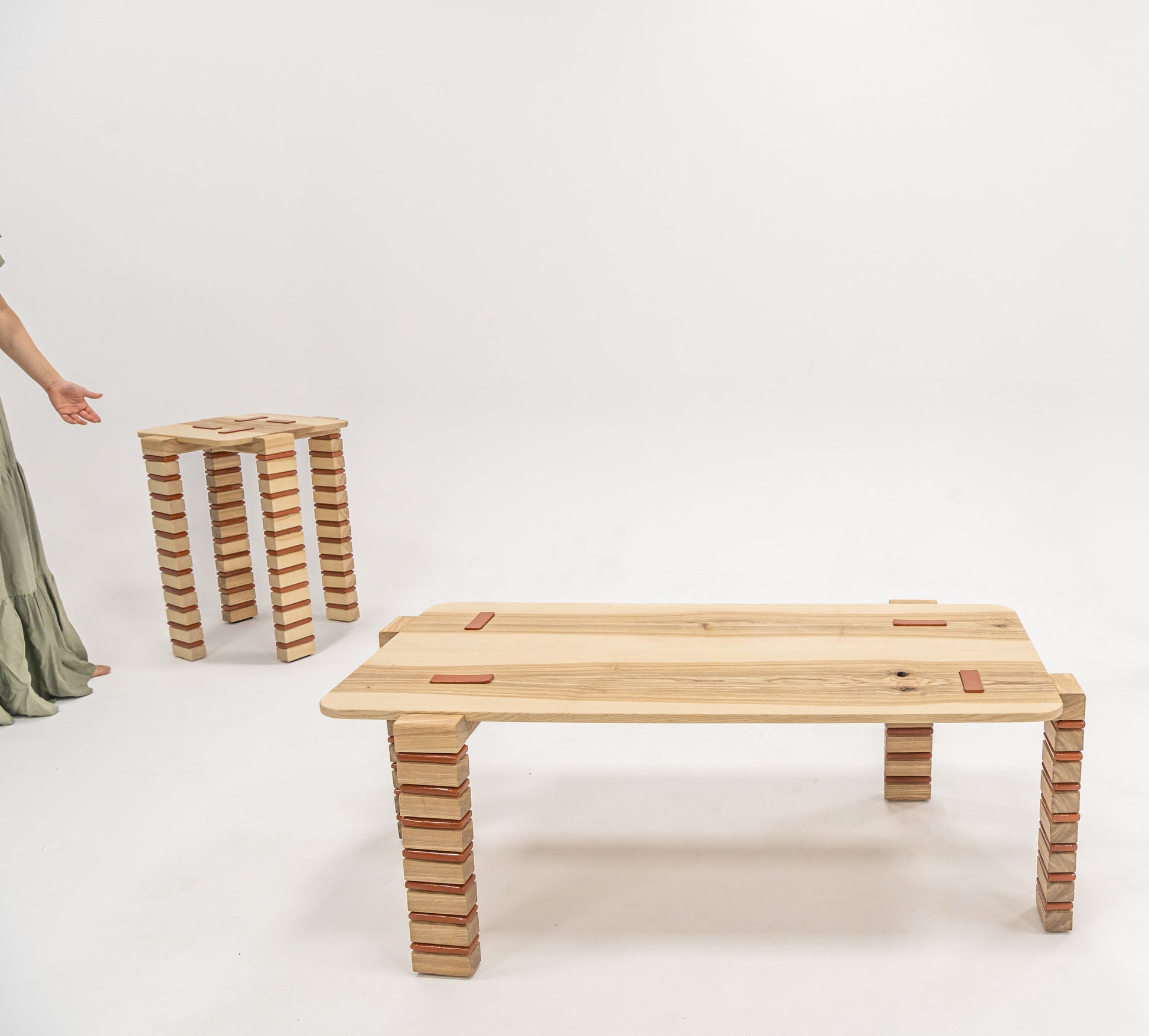 A perfect companion to the coffee table, this side table carries the same layered aesthetic, with a recessed terracotta detail that ties the wooden top to its legs. Compact and versatile, it can stand by your sofa, bed, or reading nook — a subtle statement piece that balances craft and function.